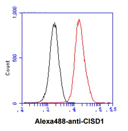 Flow Cytometry: THP-1 cell line stained with ARG57013 anti-CISD1 / mitoNEET antibody [1A8] at 2-5 µg for 1x10^6 cells (red line). Secondary antibody: Goat anti-Mouse IgG Alexa fluor 488 conjugate. Isotype control antibody was Mouse IgG (black line).