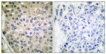 Immunohistochemistry: Paraffin-embedded Human breast carcinoma tissue stained with ARG66692 anti-CPI-17 phospho (Thr38) antibody. The picture on the right is blocked with the phosphopeptide.