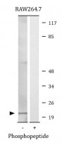 Western blot: RAW264.7 cell lysates stained with ARG66692 anti-CPI-17 phospho (Thr38) antibody. The lane on the right is blocked with the phosphopeptide.