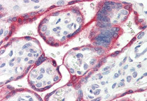 Immunohistochemistry: Paraffin-embedded Human placenta tissue. Antigen Retrieval: Steam tissue section in Citrate buffer (pH 6.0). The tissue section was stained with ARG64444 anti-CYP19A1 / Aromatase antibody at 4 µg/ml dilution followed by AP-staining.