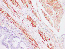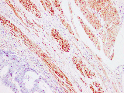 Immunohistochemistry: Paraffin-embedded Human colon stained with ARG66481 anti-Caldesmon antibody at 1:200 (4°C, overnight). Antigen Retrieval: Tris/EDTA buffer (pH 8.0) was used.