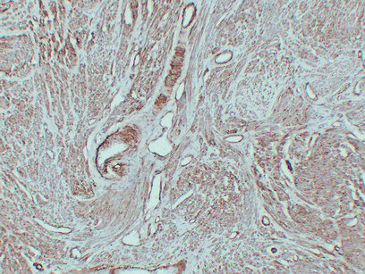 Immunohistochemistry: Paraffin-embedded Human leiomyoma stained with ARG66481 anti-Caldesmon antibody at 1:200 (4°C, overnight). Antigen Retrieval: Tris/EDTA buffer (pH 8.0) was used.