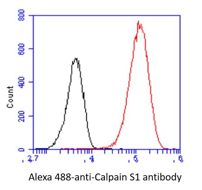 Flow Cytometry: HeLa cell line stained with ARG57147 anti-Calpain S1 antibody [1D11] at 2-5 µg for 1x10^6 cells (red line). Secondary antibody: Goat anti-Mouse IgG Alexa fluor 488 conjugate. Isotype control antibody: Mouse IgG (black line).