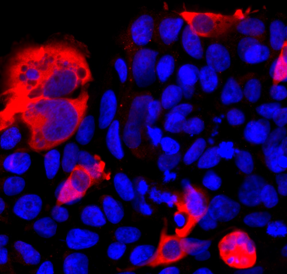 Immunofluorescence: HEK293 cells transfected with pCI-Neo-Mod vector including DNA encoding full length Cas12j protein. Cells were stained with ARG11153 anti-Cas12j antibody (red). Hoechst (blue) for nuclear staining.