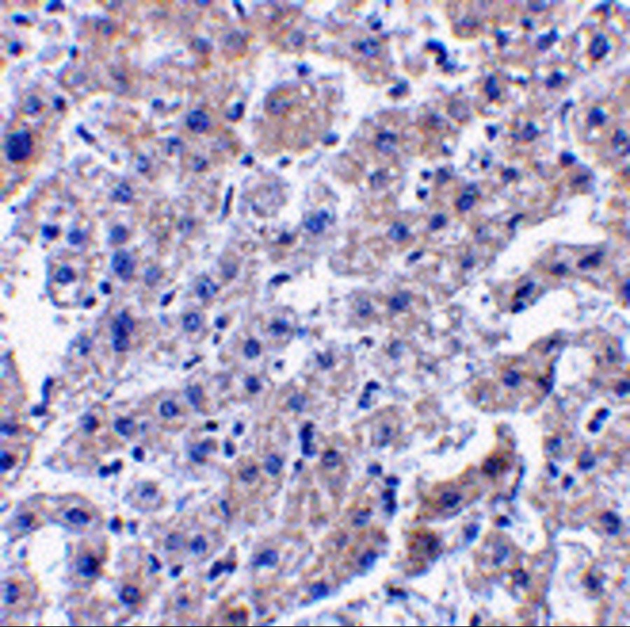 Immunohistochemistry: caspase-14 in Human liver tissue stained with ARG55179 anti-Caspase 14 antibody at 2.5 ug/ml dilution.