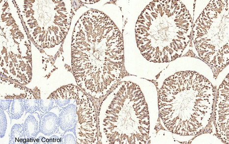 Immunohistochemistry: Paraffin-embedded Rat testis tissue. Antigen Retrieval: Heat mediation was performed in Sodium citrate buffer (pH 6.0) for 20 min. Tissue section was stained with ARG66671 anti-Caspase 3 (cleaved) antibody at 1:200 dilution, overnight at 4°C. Negative control was used by secondary antibody only.