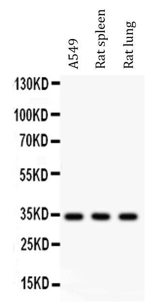 Western blot: 40 µg of A549, 50 µg of Rat spleen and 50 µg of Rat lung lysates stained with ARG41639 anti-Caspase 7 antibody at 0.5 µg/ml dilution.