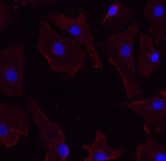Immunofluorescence: A549 stained with ARG67056 anti-ChemR23 / CMKLR1 antibody at 1:200 dilution.