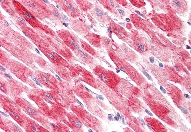 Immunohistochemistry: Paraffin-embedded Human heart tissue. Antigen Retrieval: Steam tissue section in Citrate buffer (pH 6.0). The tissue section was stained with ARG63822 anti-Cofilin 2 antibody at 3.75 µg/ml dilution followed by AP-staining.