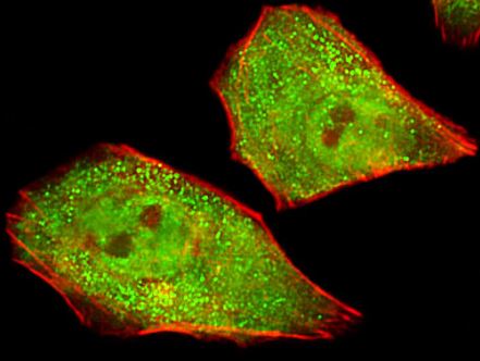 Immunofluorescence: U251 cells stained with ARG54841 anti-Collagen IV antibody (green) at 1:25 dilution. Cytoplasmic actin was counterstained with Alexa Fluor® 555 conjugated with Phalloidin (red).