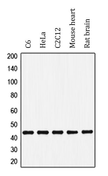 Western blot: C6, HeLa, C2C12, Mouse heart and Rat brain whole cell lysates stained with ARG66599 anti-Connexin 43 antibody.