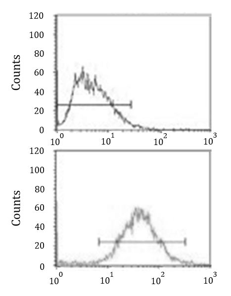 Flow Cytometry: HepG2 cells stained with ARG54688 anti-Cyclin A2 antibody (bottom histogram) or without primary antibody as control (top histogram), followed by incubation with FITC labelled secondary antibody.