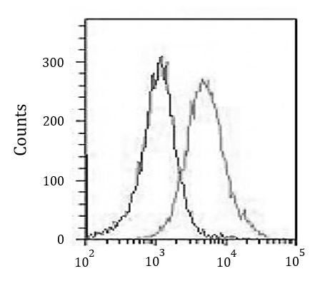 Flow Cytometry: HeLa cells were fixed with 2% paraformaldehyde (10 min) and then permeabilized with 90% methanol for 10 min. The cells were incubated in 2% BSA to block non-specific protein-protein interactions and stained with ARG56223 anti-Cyclophilin B antibody (right histogram) at 1:25 dilution for 60 min at 37°C, followed by incubation with DyLight® 488 labelled secondary antibody. Isotype control antibody (left histogram) was Rabbit IgG (1 µg/10^6 cells) used under the same conditions. Acquisition of > 10000 events was performed.