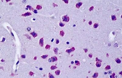 Immunohistochemistry: Paraffin-embedded Mouse brain tissue. Antigen Retrieval: Steam tissue section in Citrate buffer (pH 6.0). The tissue section was stained with ARG64171 anti-Cyld antibody at 5 µg/ml dilution followed by AP-staining.