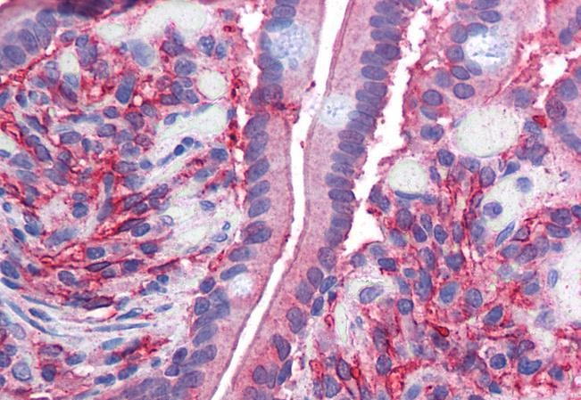 Immunohistochemistry: Paraffin-embedded Human small intestine tissue. Antigen Retrieval: Steam tissue section in Citrate buffer (pH 6.0). The tissue section was stained with ARG63717 anti-Cytochrome b reductase 1 antibody at 2.5 µg/ml dilution followed by AP-staining.