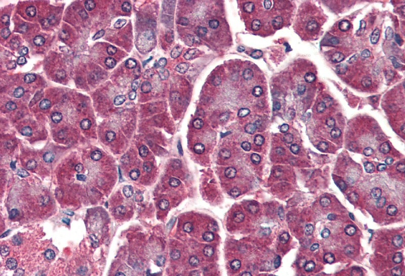 Immunohistochemistry: Paraffin-embedded Human pancreas tissue. Antigen Retrieval: Steam tissue section in Citrate buffer (pH 6.0). The tissue section was stained with ARG64680 anti-DAGLA antibody at 5 µg/ml dilution followed by AP-staining.