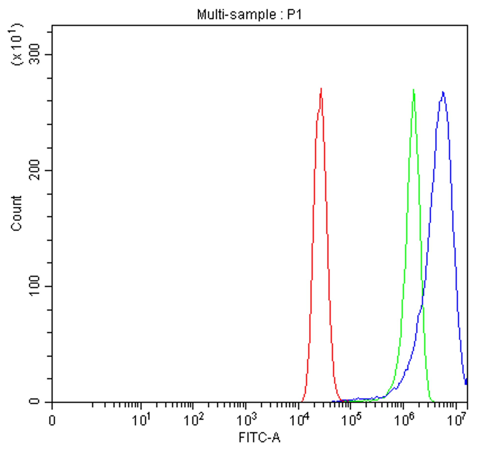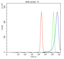 Flow Cytometry: MCF-7 cells were blocked with 10% normal goat serum and then stained with ARG43800 anti-DCT / TRP2 antibody (blue) at 1 µg/10^6 cells for 30 min at 20°C, followed by incubation with DyLight®488 labelled secondary antibody. Isotype control antibody (green) was rabbit IgG (1 µg/10^6 cells) used under the same conditions. Unlabelled sample (red) was also used as a control.