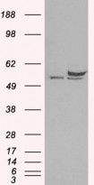 Western blot: 1) Mock transfection and 2) Human DDX6 (RC209431) expressing plasmid transfected HEK293 cell lysate stained with ARG63911 anti-DDX6 antibody.