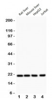 Western blot: 1) Rat liver, 2) Mouse liver, 3) HepG2 and 4) Jurkat cell lysates stained with ARG58022 anti-DHFR antibody.