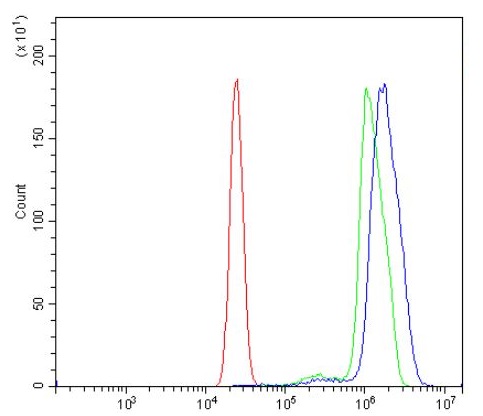Flow Cytometry: U937 cells were blocked with 10% normal goat serum and then stained with ARG43429 anti-DHODH antibody [4E3] (blue) at 1 µg/10^6 cells for 30 min at 20°C, followed by incubation with DyLight®488 labelled secondary antibody. Isotype control antibody (green) was mouse IgG (1 µg/10^6 cells) used under the same conditions. Unlabelled sample (red) was also used as a control.