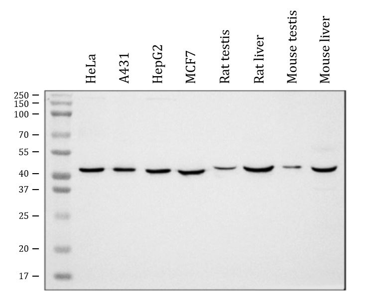 Western blot: 30 µg of sample under reducing conditions. HeLa, A431, HepG2, MCF7, Rat testis, Rat liver, Mouse testis and Mouse liver lysates stained with ARG43429 anti-DHODH antibody [4E3] at 0.5 µg/ml dilution, overnight at 4°C.