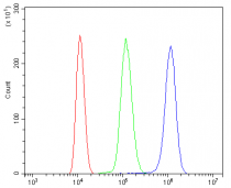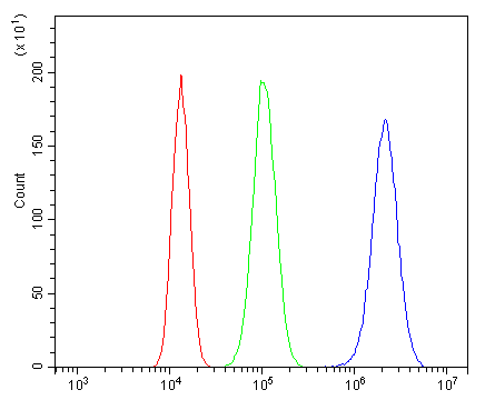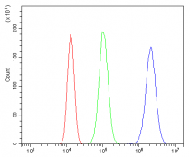 Flow Cytometry: 293T cells were blocked with 10% normal goat serum and then stained with ARG42701 anti-DIO1 antibody (blue) at 1 µg/10^6 cells for 30 min at 20°C, followed by incubation with DyLight®488 labelled secondary antibody. Isotype control antibody (green) was rabbit IgG (1 µg/10^6 cells) used under the same conditions. Unlabelled sample (red) was also used as a control.