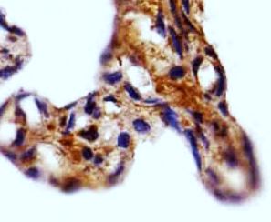Immunohistochemistry: Paraffin-embedded Human placenta tissue stained with ARG55228 anti-DLK1 antibody at 1:25 dilution.
