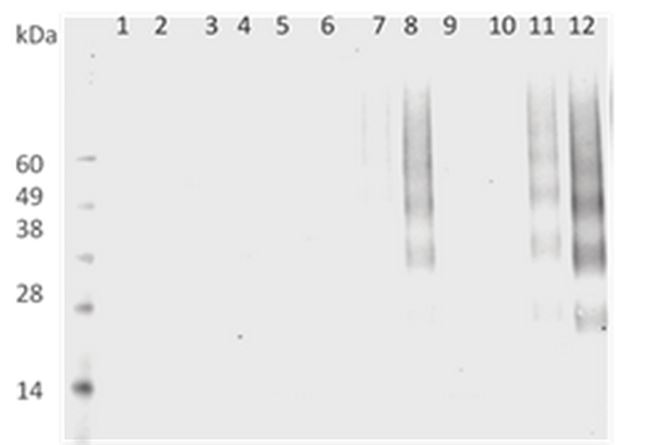 Western blot: 1) 10 uM Hb (Hemoglobin), 2) 10 uM Hb + 100 uM HOCI, 3) 10 uM Hb + 500 uM HOCI, 4) 10 uM Hb + 1000 uM HOCI, 5)-8) as above with 20 mM DMPO, 9)-12) as above with 100 mM DMPO. Staining with ARG20538 anti-DMPO Nitrone Adduct antibody [N166A4].