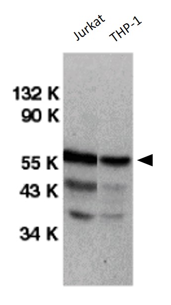 Western blot: Jurkat and THP-1 cell lysates stained with ARG58004 anti-DOK1 / p62 Dok antibody at 1 µg/ml dilution.