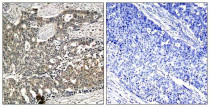Immunohistochemistry: Paraffin-embedded Human breast carcinoma tissue stained with ARG51759 anti-DOK2 phospho (Tyr299) antibody (left) or the same antibody preincubated with blocking peptide (right).