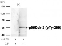 Western blot: Extracts from JK cells, treated with G-CSF or calf intestinal phosphatase (CIP), stained with ARG51759 anti-DOK2 phospho (Tyr299) antibody.