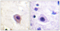 Immunohistochemistry: Paraffin-embedded Human brain tissue stained with ARG66781 anti-DPYSL2 / CRMP2 phospho (Thr514) antibody. The picture on the right is blocked with the phospho peptide.