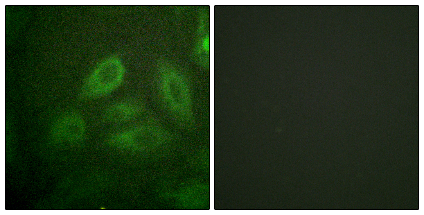 Immunofluorescence: HeLa cells stained with ARG66781 anti-DPYSL2 / CRMP2 phospho (Thr514) antibody. The picture on the right is blocked with the phospho peptide.
