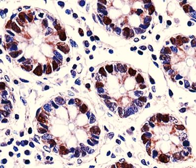 Immunohistochemistry: Formalin-fixed and paraffin-embedded Human colon tissue stained with ARG58539 anti-DUT / Dutpase antibody.