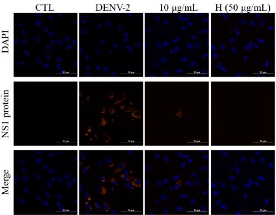 Immunofluorescence: ARG65660 anti-Dengue virus NS1 antibody [SQab1501] (1:400) were used for detecting DENV NS1.