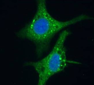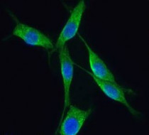 Immunofluorescence: Paraformaldehyde-fixed NIH/3T3 cells, permeabilized with 0.15% Triton. Cells were stained with ARG41161 anti-Doublecortin antibody (green) at 10 µg/ml dilution for 1 hour. DAPI (blue) for nuclear staining.