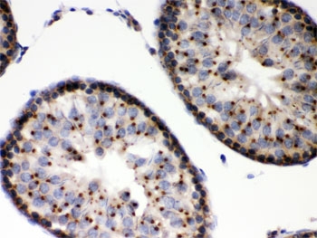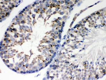 Immunohistochemistry: Formalin-fixed and paraffin-embedded Mouse testis stained with ARG58133 anti-EBAG9 / RCAS1 antibody. Antigen Retrieval: Boil tissue section in 10mM Citrate buffer (pH 6.0) for 20 min followed by cooling at RT.
