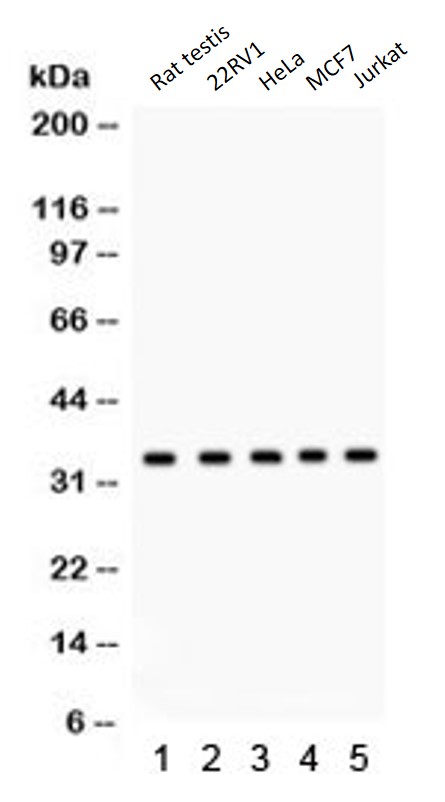 Western blot: Rat testis, 22RV1, HeLa, MCF7 and Jurkat cell lysates stained with ARG58133 anti-EBAG9 / RCAS1 antibody.