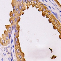 Immunohistochemistry: Formalin-fixed and paraffin-embedded Human prostate cancer tissue section. Antigen Retrieval: Heat mediation was performed in Sodium citrate buffer (pH 6.0). The section was then stained with ARG66622 anti-EDIL3 antibody at room temperature and detected using an HRP conjugated compact polymer system. DAB was used as the chromogen. The section was then counterstained with haematoxylin and mounted with DPX.