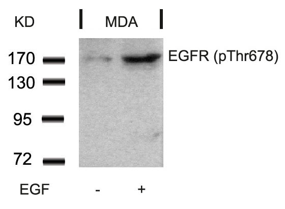 Western blot: Extracts from MDA cells untreated or treated with EGF stained with ARG51681 anti-EGFR phospho (Thr678) antibody.
