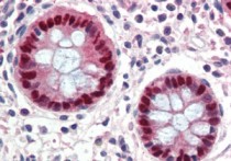 Immunohistochemistry: paraffin embedded Human Colon. (Steamed antigen retrieval with citrate buffer pH 6) stained with ARG64290 anti-EGR2 antibody at 3.8 µg/ml dilution followed by AP-staining.