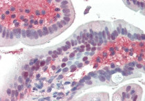 Immunohistochemistry: Paraffin-embedded Human small intestine tissue. Antigen Retrieval: Steam tissue section in Citrate buffer (pH 6.0). The tissue section was stained with ARG64290 anti-EGR2 antibody at 3.8 µg/ml dilution followed by AP-staining.