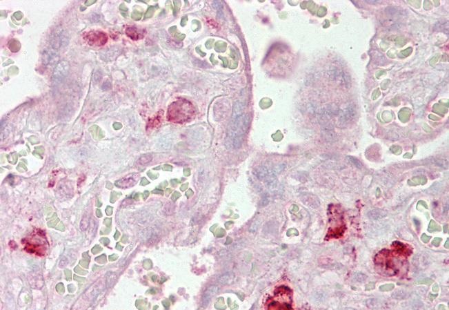 Immunohistochemistry: Paraffin-embedded Human placenta tissue. Antigen Retrieval: Steam tissue section in Citrate buffer (pH 6.0). The tissue section was stained with ARG63916 anti-EIF2C1 / AGO1 antibody at 2.5 µg/ml dilution followed by AP-staining.