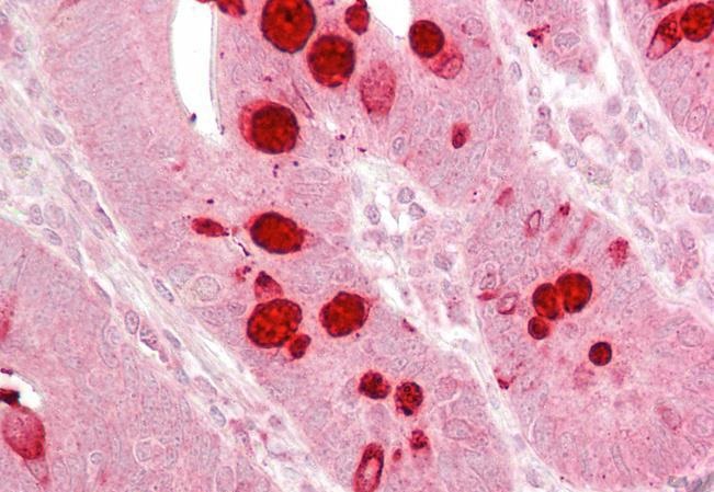 Immunohistochemistry: Paraffin-embedded Human small intestine tissue. Antigen Retrieval: Steam tissue section in Citrate buffer (pH 6.0). The tissue section was stained with ARG63916 anti-EIF2C1 / AGO1 antibody at 2.5 µg/ml dilution followed by AP-staining.