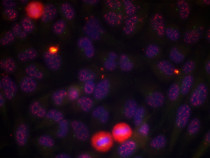 Immunofluorescence: methanol-fixed HeLa cells stained with ARG51542 anti-ELK1 phospho (Thr417) antibody (red).