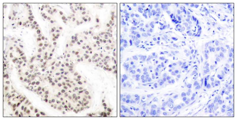 Immunohistochemistry: Paraffin-embedded Human breast carcinoma tissue stained with ARG51542 anti-ELK1 phospho (Thr417) antibody.