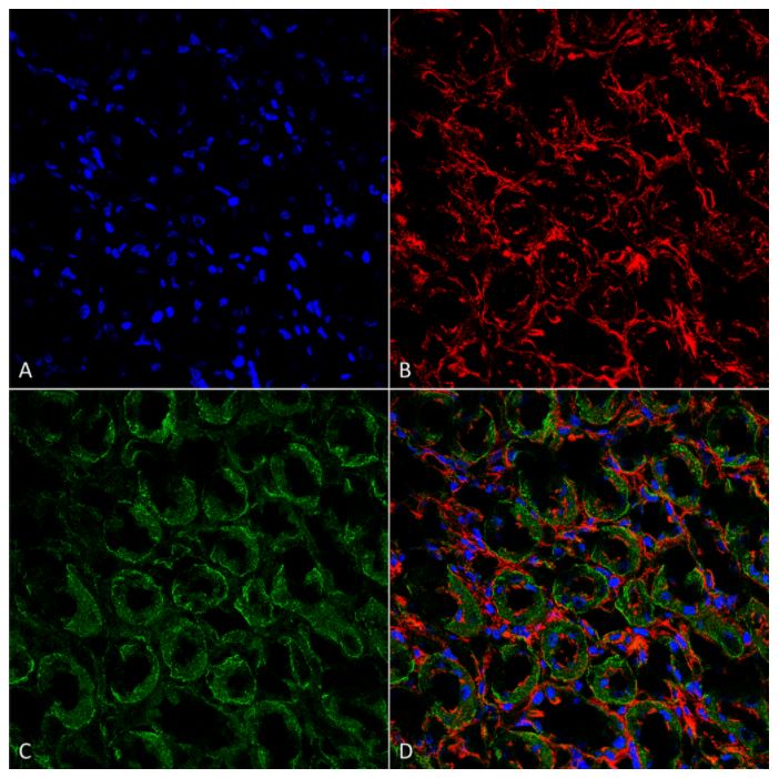 Immunohistochemistry: Formalin-fixed and paraffin-embedded Rat kidney tissue stained with ARG22200 anti-ENaC alpha antibody (green) at 1:25 dilution for 1 hour at RT. Phalloidin-Alexa Fluor 633 (red) for actin staining. DAPI (blue) for nuclear staining.
