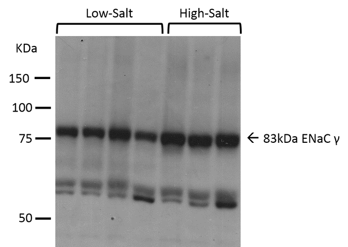 Western blot: Mouse kidney cortex stained with ARG22202 anti-ENaC gamma antibody at 1:1000 dilution. Low-salt diet (lanes 1-4) compared to a high-salt diet (lanes 5-7). 70kDa degradation band observed in low-salt.