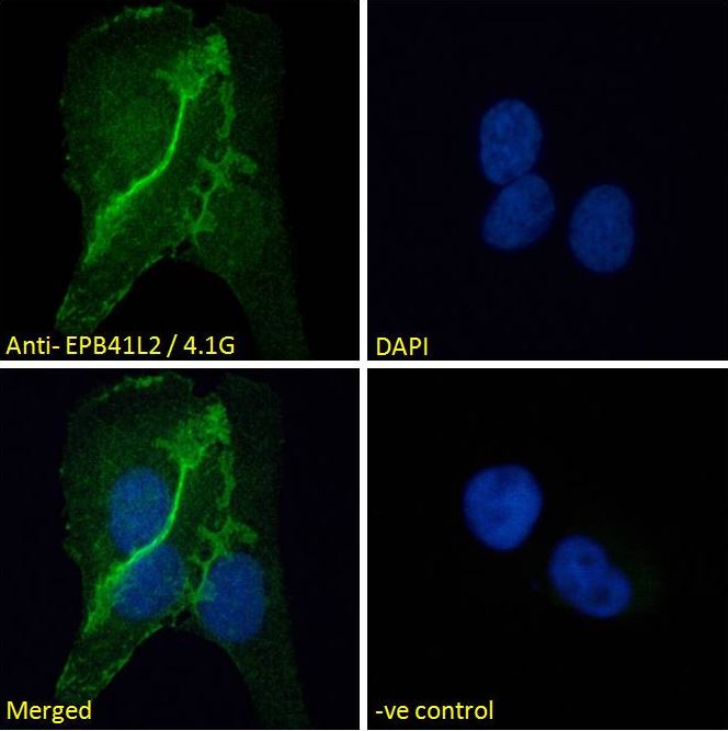 Immunofluorescence: Paraformaldehyde-fixed U2OS cells permeabilized with 0.15% Triton. Cells were stained with ARG64370 anti-EPB41L2 / 4.1G antibody (green) at 10 µg/ml dilution for 1 hour. DAPI (blue) for nuclear staining. Negative control: Unimmunized goat IgG (green) at 10 µg/ml dilution.