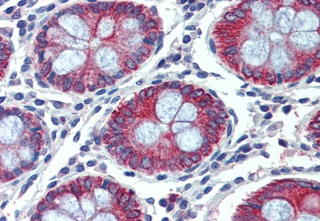 Immunohistochemistry: Paraffin-embedded Human colon tissue. Antigen Retrieval: Steam tissue section in Citrate buffer (pH 6.0). The tissue section was stained with ARG64370 anti-EPB41L2 / 4.1G antibody at 2.5 µg/ml dilution followed by AP-staining.